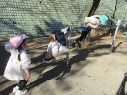 「先生、見てて」と桜組(年少組)が声をかけてきました。「何かな?」とそばまで行くと鉄棒にぶら下がって「見て!」と得意気に見せてくれました。できるようになったことがうれしくて見せてくれました。