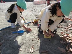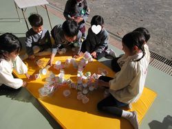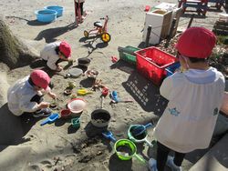 こちらは何をしているのでしょう。声をかけると「先生見て、砂にケーキのあとがつくんだよ」と型に砂を入れるのではなく、園庭の砂の上に型のあとをつけて遊んでいました。いろいろな場所で新たな遊びを見つけるのはさすがです。