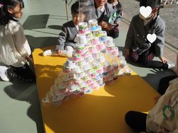 午後「先生見て!写真撮って」「だれも触らないでね、崩れるから」と松組(年長組)の子ども達から声を掛けられました。廃材のヨーグルトカップを高くピラミッドのように積む遊びがブームです。今日は今までで一番高く積み上げられたようです。