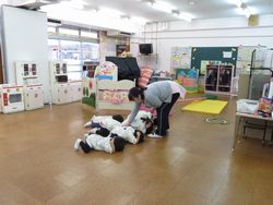 今日は桜組とひまわり組とちゅうりっぷ組は、はじめて保育室に机が出ていない時の避難体勢の話をし、実際に訓練してみました。