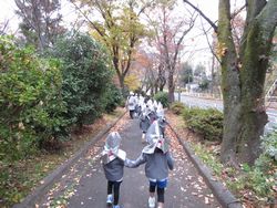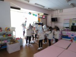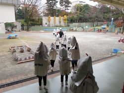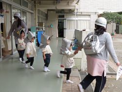 揺れがおさまったという放送が流れると、防災帽子をかぶり、園庭に避難します。