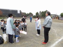 訓練が終わった後、鹿島小学校の50周年のお祝いに、松組(年長組)の子どもたちの作った鹿島小学校のキャラクターと、クラスごとに作ったカレンダーのついたお祝いのプレゼントを、校長先生に渡しました。