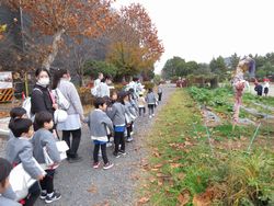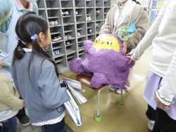 すると、校長先生のご厚意で、小学校の子どもたちの作った本物の(?)キャラクターや小学校の畑や田んぼを見せて頂きました。