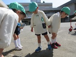 松組(年長組)は着替えが終わると早速園庭へ!!久しぶりの園庭に出ると「わあ、アリの巣がいっぱいあるよ」「見て、こっちもいっぱいありがいる」と皆、下を向いてあり探し。