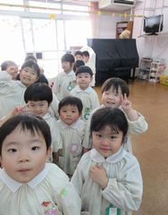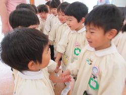 松組が桜組(年少組)の保育室へお迎えに行き、手をつないでいるところをパチリ!皆いい笑顔です。