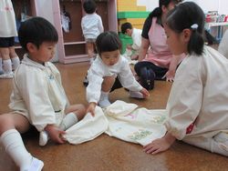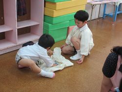 松組に手をひかれながら、保育室に戻った桜組。松組のお兄さんやお姉さんに手を貸してもらいながら、帰る準備をしました。松組は、初めて“人に教える”ということで、思わず手を出し、やってあげていましたが一生懸命お世話をしてくれました。
