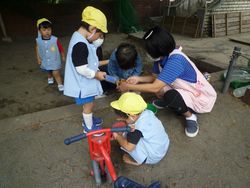 年長組のお兄さん、お姉さんのように言葉で遊び方を伝えられないけれど、一緒に遊んで見せてあげる姿も見られました。