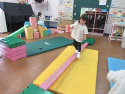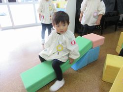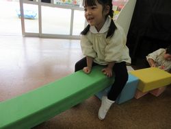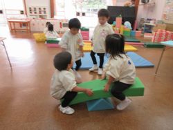 桜組が遊んでいると、ひまわり組(満3歳児)の子ども達も遊びに来てくれます。今日はカラー積み木で作ったシーソーが大人気。