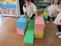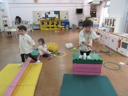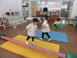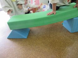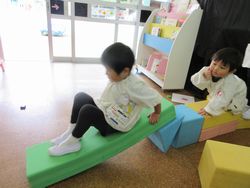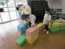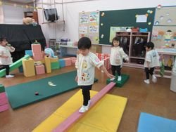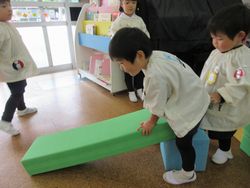 尋ねてみると、「すべり台を作ってるの」と言っています。昨日は小さなすべり台を保育室に持ってきてありましたが、今日はにこにこルーム(1・2歳児クラス)があるので、にこにこルームの部屋に戻してしまっていたのです。子どもたちは大好きなすべり台で遊びたくて、作り始めたのですね。