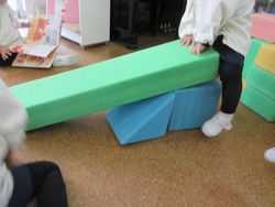 「じゃぁ三角(のカラー積み木)を入れてみる?」と積み木を入れてみて、ひまわり組の友達に滑ってもらいます。「どう?」