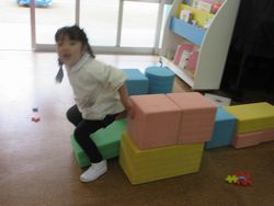 「こうしてみたよ」横にカラー積み木を置いて、手すりを作ると、少し滑りやすくなったようです。