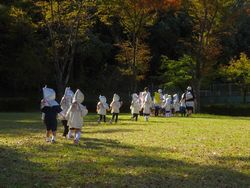 「ひまわりくみ3名いますね」ひまわり組もみんなで避難します。