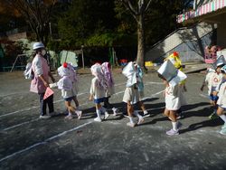 防災帽子を被り、園庭に避難します。多くのこどもも防災帽子も一人で被れるようになりました。