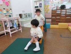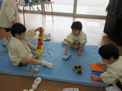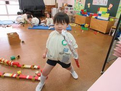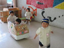 ひまわり組(満3歳児)の時から大好きな、乗り物の出発です。今日は雨なので、玄関ホールから1階の1番奥の保育室までを、何度も何度も往復していました。(子どもたちは汗をかきながら、遊んでいました)