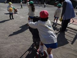 こちらの梅組(年中組)のお兄さんは小さなお友達をスケーターに乗せてあげると前から引っ張って動かしてくれていました。なかなか小さなお友達と接することもない幼稚園の子どもたちも、げんき広場に来た小さなお友達と接することで、優しい気持ちも芽生えているようです。