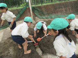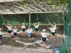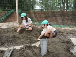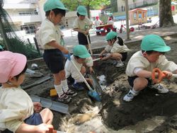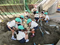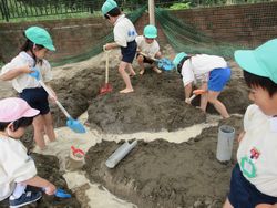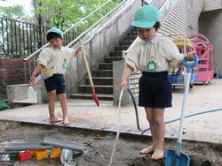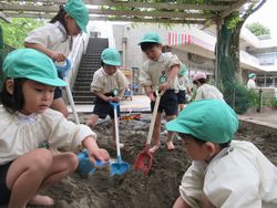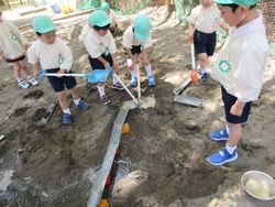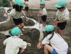 昨日は少し暑いくらいでしたね。子ども達も暑くなってくると涼しい場所を自然と好むようで、砂場遊びが始まりました。
