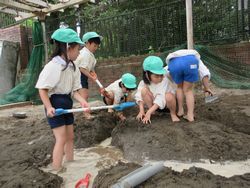 水があふれてくると、「そっちに水、行ったよ」「OK!!」「こっちに川作るね」「いいよ」など新たに川を作ったりと大忙しな松組(年長組)です。気が付くと靴下や靴に泥が跳ねているのを見て「ああ、靴下脱いでおけばよかったね」と先生がぼそっと言ったのを聞いていたようで、「靴下脱いでおくね」「今日も昨日の続きをするから、先に靴下脱いでおこう」と今日は身支度の時から準備万端。