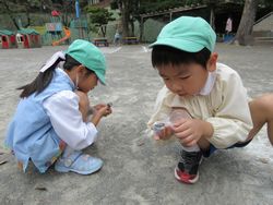 松組(年長組)が今日「先生、この磁石使っていい?」と磁石を手にして、保育室内のいろいろなところにつけて遊んでいました。「椅子にはくっついたけど、机のピンクのところにはつかなかったよ」と試して遊んでいました。保育室内では物足りなくなり、「この磁石を外に持っていくんだ」と園庭に持っていき、三輪車やスケーター、運動会で使用するラインマーカーなどいろいろなところにくっつけて遊んでいました。