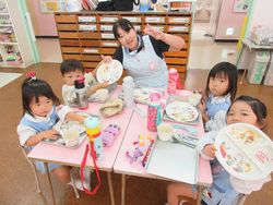 給食時終了頃、桜組(年少組)のクラスをのぞくと「見てみて!みんな食べたんです」と嬉しそうな声をかけられて、お皿がピカピカになったところを見せてくれましたので、パチリ!!
