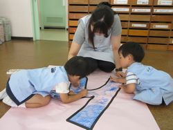 松組2人と、ちゅうりっぷ組(未就園児・2歳児)の子どもが並んで遊んでいます。でも「一緒に」は遊んでいないようで、会話はまったくありません。それぞれが黙々と自分の好きなことをしています。でも小さな子どもは、目の端でお兄さんの姿を見ながら、遊び方を広げていくんだろうなと感じた1場面でした。