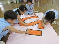 はじめは「大きすぎる」「できるかな?」と言っていた桜組も、最後は担任が「もうできあがりにする?」と聞いても「まだまだ」と言って夢中になって塗っていました。