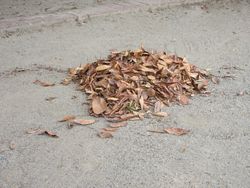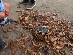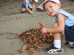 砂場の近くに、落ち葉の集まっているところを見つけました。するとある子どもが「焼き芋だ。先生、焼き芋しようよ」と言い出しました。