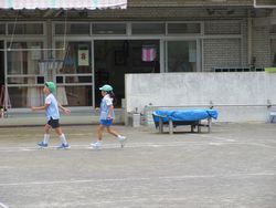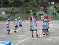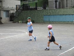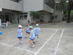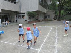 園庭の真ん中では、松組と梅組(年中組)がリレーを始めました。松組も梅組も、ひまわり組(満3歳児)や桜組の時から、当時の松組の姿を見て、リレーごっこをしていたので、「リレー」が1つの遊びのようになっています。そのうち桜組やひまわり組も参加するようになると思います。楽しみですね。