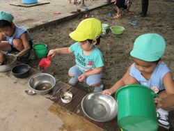 桜組が砂場を独占して遊んでいると、松組(年長組)が園庭に出てきました。