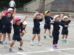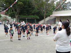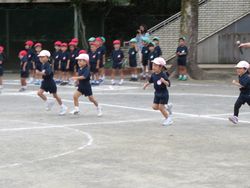 準備運動の「たけのこ体操」やかけっこも元気いっぱいです。