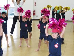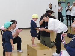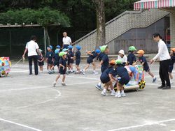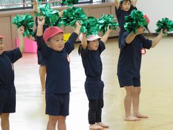 今年度は全園児で、玉入れを行いました。ひまわり組(満3歳児)や桜組(年少組)はなかなか玉が入りませんでしたが、みんな楽しんで参加することができました。