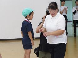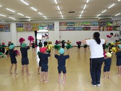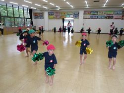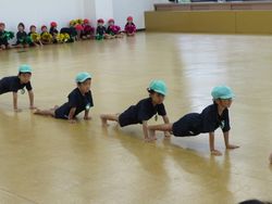 遊戯ははじめて遊戯室で行いました。でも子どもたちはまったく戸惑うことなく、普段通り、元気に踊っていました。