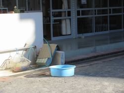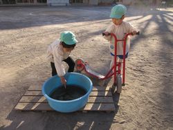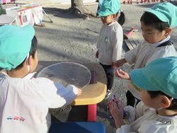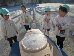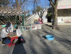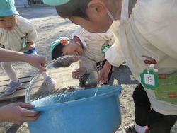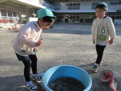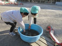 園庭には園舎の近くと、砂場の近く、2つたらいが出ており、どちらも水がはってあります。砂場の近くのたらいに氷があったので、園舎近くのたらいにも氷ができていると思ったようです。見に行くと・・・水のまま・・・「なんで?」子どもたちは不思議そうにしていました。今度試してみましょうね。