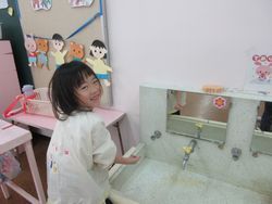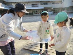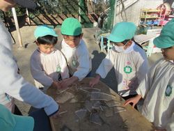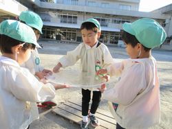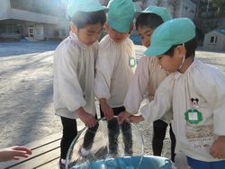 桜組(年少組)の保育室では、水道に置いておくと、手を洗おうとした子どもがびっくりしていました。幼稚園の園庭でできていたことにまた驚いていました。でも氷を見ることができたのは、1番早く到着したバスの子どもだけでした。暖かい保育室では氷は5分も持たずに溶けてしまいました。